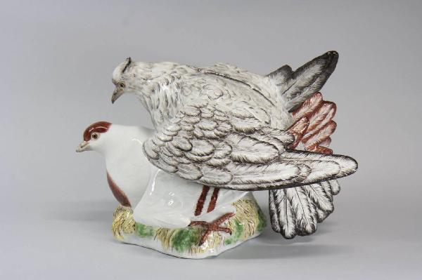 - NOTIZIE STORICO CRITICHE La scultura in porcellana con due tortore, donata insieme ad altre diciotto opere al FAI nel 2013, proviene dalla collezione di Angelo Zegna. Le opere - suppellettili e ceramiche - sono collocate al piano terra della villa, tra Biblioteca, Salone, Sala da Pranzo e Veranda. Il gruppo di tortore trova collocazione nel Salone, sopra il vassoio cinese. È attorno al quarto decennio del XVIII secolo che, accanto alle tradizionali pitture di ispirazione orientale, compaiono a Meissen motivi di gusto europeo tra cui animali - per lo più insetti e uccelli - rappresentati con attenzione ai particolari e abilmente realizzati, con lo scopo di decorare le tavole nobili durante i banchetti.