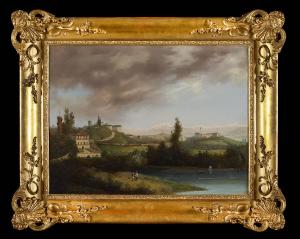 - NOTIZIE STORICO CRITICHE Il dipinto, opera del bergamasco Marco Gozzi (1759-1839), è una veduta de\nlla residenza di campagna della famiglia Moroni a Villa d¿Ogna, costruit\na nel XVII secolo e dotata di un meraviglioso parco. Utilizzata per la villeggiatura, ma strategica per gli interessi commerciali della famiglia in Val Seriana, la villa nei secoli ha subito parecchie trasformazioni; dal 1949 è sede di un convento monastico e proprietà dell¿Istituto don Luig\ni Palazzolo delle Suore Poverelle. In primo piano è raffigurato il fiume \nSerio, sulle cui rive passeggiano due personaggi; sullo sfondo appare il borgo di Ogna, dominato dalla residenza della famiglia. La rappresentazione, fedele e precisa, suggerisce un¿esecuzione posteriore al 1810. Dopo av\ner ottenuto da Eugenio di Beauharnais l¿incarico di paesista ufficiale (\n1807), con il compito di fornire ogni anno al Ministero dell¿Interno tre\n paesaggi che documentassero il territorio lombardo, Gozzi infatti abbandonò le soluzioni accademiche settecentesche e diede alla sua produzione un\na svolta in chiave naturalistico-documentaria. Nato il 5 novembre 1759 a San Giovanni Bianco, in provincia di Bergamo, Marco Gozzi è considerato l? ??iniziatore del paesaggio lombardo moderno. Definito nelle recensioni all\ne mostre di Brera il ¿Nestore dei paesisti in Lombardia¿ (¿Belle Art\ni¿ 1825, ¿Album¿ 1837), fu il primo lombardo a recuperare e riscopri\nre la pittura di paesaggio, distinguendosi per ¿lo slancio cristallino d\nelle sue prospettive aeree, l¿eleganza delle sue rilevazioni topografich\ne, la lievità dei suoi giochi atmosferici¿ (Mazzocca 1990). La riscoper\nta di questo artista, accusato per lungo tempo dopo la sua morte di monotonia e freddezza, è merito di Maria Cristina Gozzoli (1975). La sua produz\nione, lodata dai contemporanei per la diligenza e la precisione esecutiva, fu molto apprezzata dal vicerè d¿Italia Eugenio di Beauharnais; con lu\ni Gozzi già nel 1807 aveva stipulato un contratto, che prevedeva la reali\nzzazione ogni anno di tre paesaggi a olio ¿ i cui soggetti erano stabili\nti dal Ministero dell¿Interno ¿ in cambio di una pensione di millecinq\nuecento lire e che sarebbe stato rinnovato cinque anni dopo, con un aumento della pensione a duemilaquattrocento lire. Obiettivo del governo prima napoleonico, poi austriaco era quello di ottenere quadri che fornissero un? ??immagine ufficiale del territorio lombardo e documentassero le nuove inf\nrastrutture realizzate; per rispondere a questa esigenza, dopo il 1810 Gozzi abbandonò gradualmente il paesaggio arcadico e il capriccio, per aderi\nre fedelmente al dato reale. Mise così a punto un modo tutto lombardo di \nstrutturare il paesaggio, che era in parte influenzato dalla tradizione olandese e che non risentì dei soggiorni dell¿artista a Roma, Napoli (181\n2) e nelle Marche (1813). I paesaggi di Gozzi rispondono a una logica naturalistico-documentaria: impostati seguendo una vera e propria gabbia compositiva, prevedono generalmente un primo piano in controluce e un piano intermedio luminoso, con un effetto di grande puntualità e precisione. Con i\nl passare del tempo, la gamma cromatica delle sue opere si spense e le composizioni divennero ripetitive e monotone. Fu forse anche per questa ragione che nell¿ultima fase della sua vita si diradarono le committenze priv\nate, per lasciare spazio soltanto alle richieste ufficiali. Presente a Brera dal 1813 al 1838, Gozzi fu un riferimento imprescindibile non solo per tutta la prima generazione di paesisti bergamaschi (primo fra tutti, Pietro Ronzoni) e lombardi dell¿Ottocento, ma anche per quelli austriaci. Non\nostante la sua importanza e la sua fama, non riuscì mai a ottenere la cat\ntedra di paesaggio all¿Accademia di Brera: l¿incarico, procrastinato f\nino al 1838, venne poi affidato al successore Giuseppe Bisi. Marco Gozzi morì a Bergamo il 15 agosto 1839; fu sepolto al cimitero di Valtesse, dove\n è ricordato con la seguente epigrafe: ¿A Marco Gozzi, uomo di semplici\n costumi, giusto, religioso, luminare e capo di una nuova scuola di pittura di paese¿.