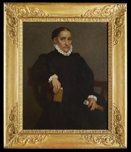 - NOTIZIE STORICO CRITICHE Attestato per la prima volta a casa Moroni nel 1824 da Gerolamo Marenzi, il dipinto è registrato nei resoconti di viaggio di Charles Lock Eastlake \nnel settembre 1855, in occasione della sua seconda visita alla dimora bergamasca: ¿an elderly female, mild expression, book in rt., glove in left,\n good¿. Era entrato a far parte della collezione nel 1817, insieme ad al\ntri tre dipinti di Giovan Battista Moroni, tutti provenienti dalla raccolta di Marcantonio Fermo Grumelli. Su una dantesca lignea siede un¿anziana\n donna, leggermente voltata verso destra e ripresa fino alle ginocchia. I suoi abiti, severi e privi di ornamenti, aderiscono al gusto e alla moda dell¿Italia settentrionale negli anni Settanta del Cinquecento e rifletto\nno le prime conseguenze sul costume femminile della Controriforma. Dal nero dell¿abito e della sopravveste spagnola emergono la gorgiera e i polsi\nni increspati, bianchissimi; dettagli che attirano l¿attenzione dell¿o\nsservatore sul volto e sulle mani della donna, descritti con grande naturalismo. L¿espressione del viso e lo sguardo penetrante sono velati di mal\ninconia, mentre le mani suggeriscono pacatezza e tranquillità: la sinistr\na è appoggiata sulle gambe e afferra un paio di guanti bianchi, la destra\n regge un libro. Il dettaglio dell¿indice ancora infilato tra le pagine \ndà l¿idea che la donna abbia improvvisamente interrotto la sua lettura \ne rende il ritratto spontaneo e veritiero. Fondale e abito sono di colore scuro, ma il pittore è riuscito a dare profondità alla scena, posizionan\ndo la seduta in diagonale, e a giocare con le delicate variazioni di tono del nero, qui rappresentate con straordinario virtuosismo. Sebbene l¿ide\nntità della donna ritratta sia ancora oggi ignota, è plausibile che sia \nun membro della famiglia Grumelli, dalla cui collezione proviene il dipinto. Paolo Plebani (2004) ha ipotizzato che si tratti di Medea Rossi (1515-1590), terza moglie di Marcantonio Grumelli e madre di Giovanni Gerolamo (raffigurato nel celebre ¿Cavaliere in rosa¿). I dettagli biografici di \nMedea non entrano in contraddizione con il dipinto e con la sua datazione: terza moglie di Marcantonio nel 1530 e madre di otto figli, rimase vedova nel 1542, a soli otto giorni dal parto del suo ultimogenito. Dopo il tragico evento, di cui lei stessa scrisse un dettagliato resoconto nel quale il marito compare come figura idealizzata, Medea si occupò in prima person\na non solo dell¿educazione dei figli, ma anche delle questioni economich\ne della famiglia e delle numerose proprietà immobili e agricole. Appassio\nnata di pittura e arti decorative, fu committente di Filippo Zanchi e di Alessandro Bonvicino detto Moretto. Tarda è la cronologia dell¿opera: co\nllocata da Venturi (1929) tra 1563 e 1565, fu posticipata intorno al 1570 dalla Lendorff (1939), che per prima notò forti affinità tra il dipinto \nin collezione Moroni e il ¿Ritratto di Pace Rivola Spini¿, soprattutto\n per la foggia degli abiti indossati dalle due donne. Questa seconda ipotesi fu confermata nel 1979 da Mina Gregori, ed è oggi generalmente accolta\n dalla critica, che colloca l'opera nella fase finale della produzione dell¿artista, come confermano la moda, la totale assenza di elementi allego\nrici o simbolici, l¿ambientazione sobria e quasi monocroma. Il dipinto Í\n¿ inoltre avvicinabile, come suggerisce Plebani (2004), al "Ritratto di donna seduta con libro" oggi in Accademia Carrara (inv. 81LC00195). Identiche l¿impostazione spaziale, la posa della donna, l¿attenzione alla resa\n delle mani, mentre diversa è la qualità della pittura: liquida e lumino\nsa quella del dipinto in Carrara, magra e opaca quella dell¿opera a Pala\nzzo Moroni. Sembra di vedere qui uno dei massimi esempi di quella ¿secch\nezza pur sempre dipinta¿ che Roberto Longhi riconosceva in certe opere t\narde del pittore. Sebbene lo scorcio del braccio destro non sia perfettamente riuscito, come pure il rapporto tra collo e testa, notevole è invece \nla resa delle mani e del volto della donna, che attestano l¿interesse di\n Moroni per il ritratto naturalistico e per il tema della figura seduta.
