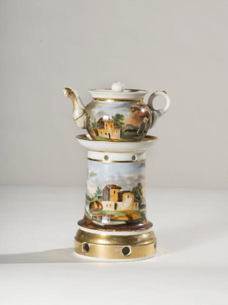 Veilleuse in porcellana dipinta a mano con decorazione raffigurante paesaggi con case, vegetazione e contadini; profilature dorate per gli orli. Composta da quattro parti: base ad anello rastremata verso l'alto con fori per areazione; fusto a sezione circolare rastremato verso l'alto con fori per areazione, orlo superiore espanso; teiera di forma panciuta con invaso, orlo superiore espanso, manico ad anello; coperchio con presa a forma sferica.