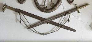 La spada, con lama a seghetto e impugnatura dorata a forma di testa di rapace, è parte di un insieme di 8 oggetti di uso militare, color ottone. L'\ninsieme è databile al XIX secolo e contiene anche la spada di Giuseppe Ro\ni (1894-1947), padre del donatore del FAI.