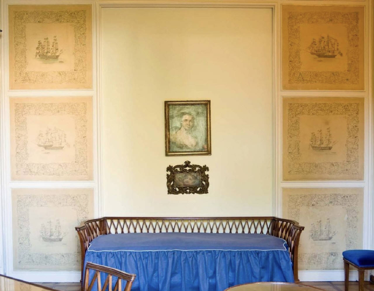 - NOTIZIE STORICO CRITICHE Ogni pannello raffigura in maniera dettagliata vascelli di differenti tipologie, inserendoli sempre all'interno di un riquadro. Questa cornice consiste in un fitto disegno in cui, a distanza ravvicinata, si riconoscono altre piccole imbarcazioni incastonate fra isole stilizzate e altri oggetti marinareschi, tra cui timoni, bussole, compassi e rose dei venti.