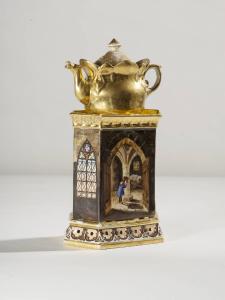 Veilleuse in porcellana dipinta a mano con raffigurazione, lungo il fusto esagonale, di personaggi entro interni di edifici di gusto neogotico alternati a vetrate gotiche. Composta da quattro parti: base esagonale rastremata verso l'alto che presenta motivi decorativi stilizzati entro profilature dorate; fusto a sezione esagonale con bordo superiore aggettante; teiera di forma panciuta con invaso, interamente dorata esternamente, orlo superiore smerlato, manico a ricciolo, beccuccio con terminazione a testa di animale; coperchio con presa a pomolo.