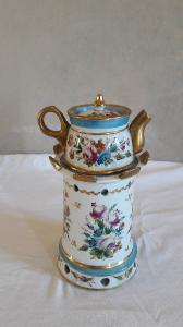 Veilleuse in porcellana dipinta a mano con decorazione raffigurante fiori policromi, profilature dorate. Composta da cinque parti: base ad anello rastremata verso l'alto con fori per areazione; fusto a sezione circolare rastremato verso l'alto con fori per areazione, orlo superiore espanso merlato; godet (piccolo recipiente atto a contenere l'olio e il lucignolo) all'interno del fusto; teiera con orlo espanso, manico ad orecchio e beccuccio di ridotte dimensioni; coperchio con presa a pomolo. Il beccuccio, il manico e il pomolo del coperchio della teiera sono dorati.
