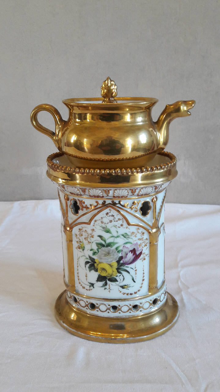 Veilleuse in porcellana dipinta a mano composta da tre parti: fusto ovale con piede ed orlo rastremati, fori per areazione nella base circolare e nella parte superiore del fusto; coronamento superiore con motivi decorativi a piccole sfere; teiera interamente dorata con manico ad orecchio, parte terminale del beccuccio a testa animale; coperchio con presa a pomolo. La decorazione pittorica entro colonnine e archi trilobati dipinti in oro consta di piccoli fiori raggruppati a mazzi resi con diversi colori e foglie verdi; presenza di elementi decorativi a rilievo. Gli orli sono profilati in oro.