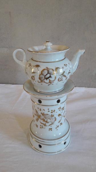 Veilleuse composta da quattro parti: base ad anello rastremata verso l'alto con fori per areazione; fusto a sezione circolare con orlo inferiore rastremato verso l'alto, orlo superiore espanso e fori per areazione; teiera di forma panciuta, con invaso, manico ad anello, beccuccio terminante a testa animale, coperchio con presa a pomolo. Il fusto è decorato con fiori \ndorati, linee dorate lungo gli orli. Anche la teiera è decorata con fiori\n in oro e profilature dorate.