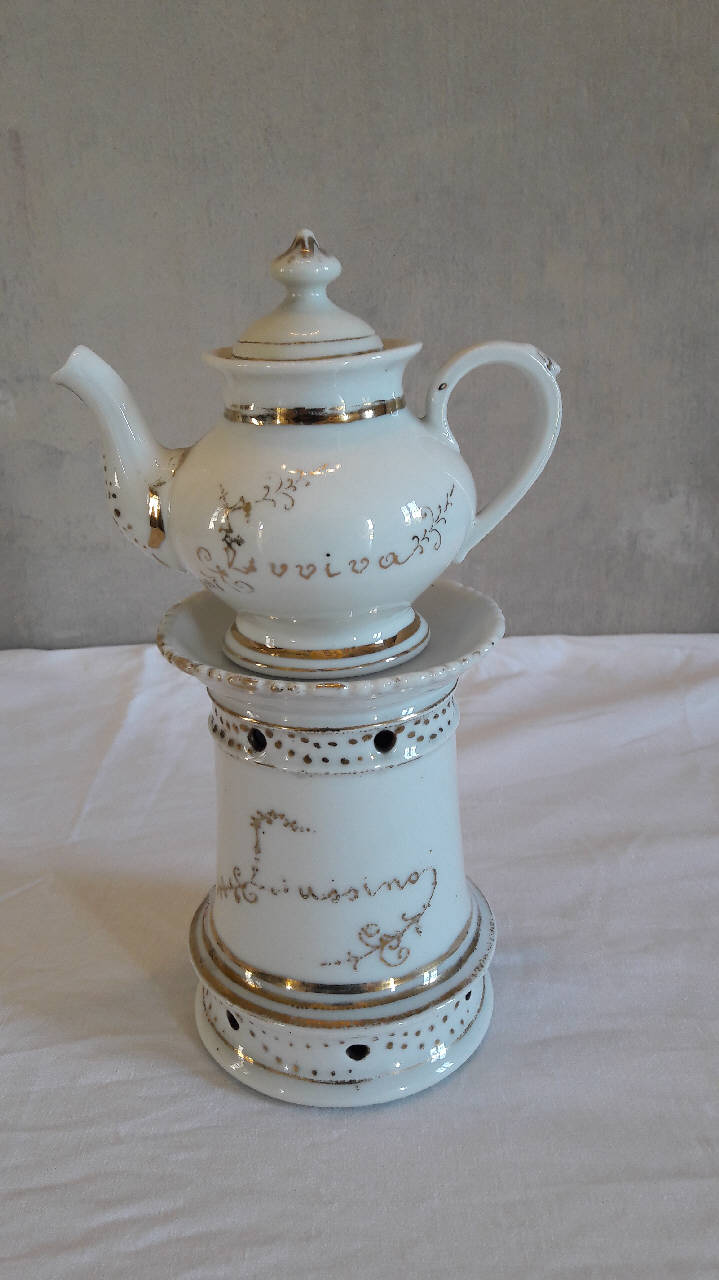 Veilleuse composta da cinque parti: base circolare con fori per areazione, fusto a sezione circolare con fori per areazione nella parte superiore, orlo superiore espanso; godet all'interno del fusto; teiera dalla forma panciuta con invaso, orlo superiore espanso, manico ad orecchio, beccuccio con terminazione allungata; coperchio con presa a pomolo . A fondo bianco, presenta sottili ramoscelli di fiori e foglie disposti sulle superfici, motivi decorativi a piccoli punti, scritte dorate. Linee dorate agli orli della base, fusto e teiera.