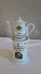 Veilleuse composta da tre pezzi e godet. Fusto a sezione circolare con leggera sguscia nella parte inferiore, apertura inferiore per il godet, fori per areazione nella parte superiore, orlo superiore espanso; teiera di forma panciuta con invaso, parte inferiore lievemente allungata, orlo superiore piuttosto stretto ed espanso, grande manico ad orecchio, beccuccio mosso; coperchio con presa a punta. Il fusto presenta una decorazione con motivi vegetali dorati; sul corpo della teiera compare la scritta inserita in uno spazio delimitato da ramoscelli con piccole foglie dorate, sorta di coppa nella parte superiore. Di fattura novecentesca che riprende i modelli dell'800.