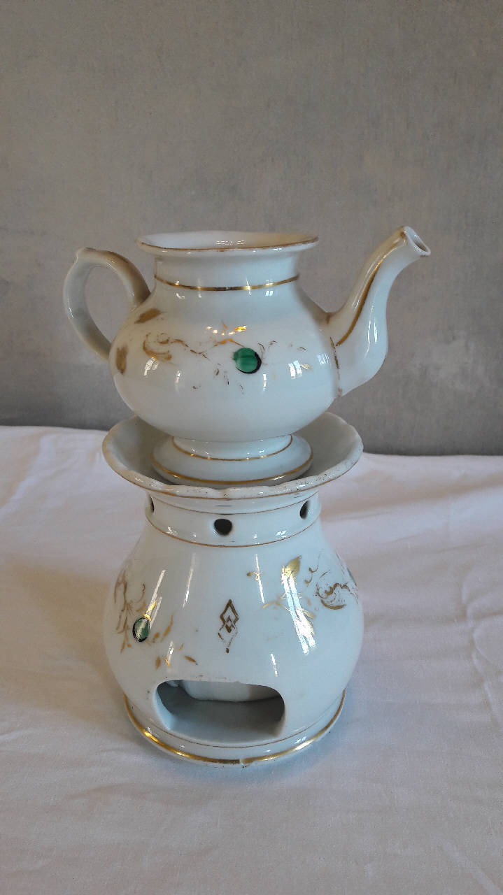 La veilleuse si compone di tre elementi: fusto a bulbo terminato da orlo a smerlo, apertura nella parte inferiore per il godet; godet all'interno del fusto; teiera periforme con lungo becco e manico ad orecchio con bitorzolo; manca il coperchio. La decorazione del fusto e della teiera consta di piccoli fiori verdi dipinti a mano collegati tra loro da foglie e ramoscelli dorati; profilature dorate.