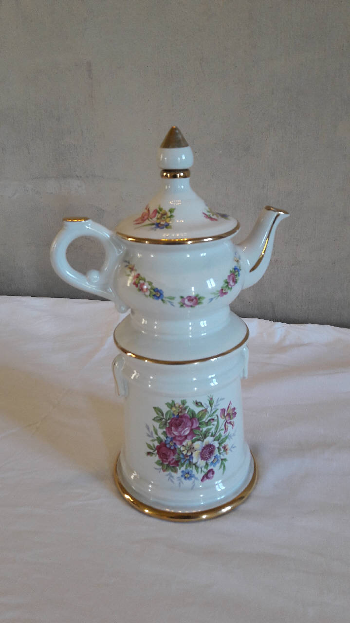 Veilleuse composta da due pezzi: fusto a sezione circolare con leggera sguscia nella parte inferiore, teiera di forma "a bulbo", orlo inferiore rastremato verso l'alto, manico ad anello, beccuccio mosso; coperchio con orlo lievemente sporgente e presa a punta. La presa del coperchio, unica parte movibile dell'intera veilleuse, è apribile e all'interno presenta un tap\npo in sughero. Motivi decorativi floreali policromi sono presenti sul fusto, sul corpo della teiera e sul coperchio: sono resi attraverso la tecnica della decalcomania con ritocchi a mano; profilature dorate. Di fattura novecentesca che riprende i modelli dell'800.
