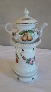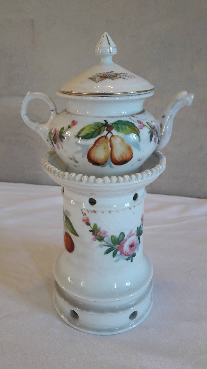La veilleuse si compone di cinque elementi: base circolare munita di fori per l'areazione, fusto cilindrico con fori superiori per areazione, orlo superiore espanso concluso da una decorazione a piccole sfere; godet all'interno del fusto; teiera panciuta con manico ad anello; coperchio con presa a punta. La decorazione dipinta a mano sul fusto, il corpo della teiera e relativo coperchio consta di fiori con foglie verdi e frutta. Gli orli sono profilati in oro.