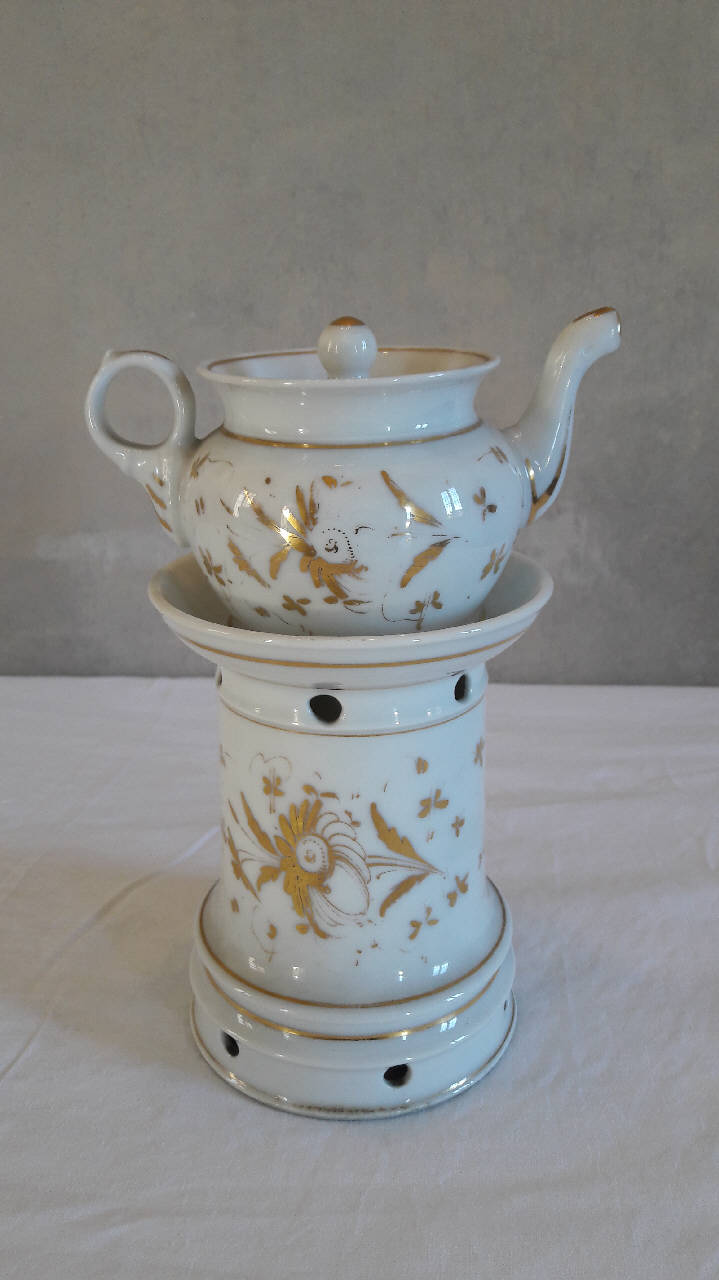Veilleuse composta da quattro parti: base ad anello con fori per areazione; fusto a sezione circolare con orlo inferiore rastremato verso l'alto, orlo superiore espanso e fori per areazione; teiera di forma panciuta, con invaso, manico ad anello, beccuccio pronunciato, coperchio con presa a pomolo. Il fusto è decorato con fiori dorati, linee dorate lungo gli orli. An\nche la teiera è decorata con fiori in oro e profilature dorate.