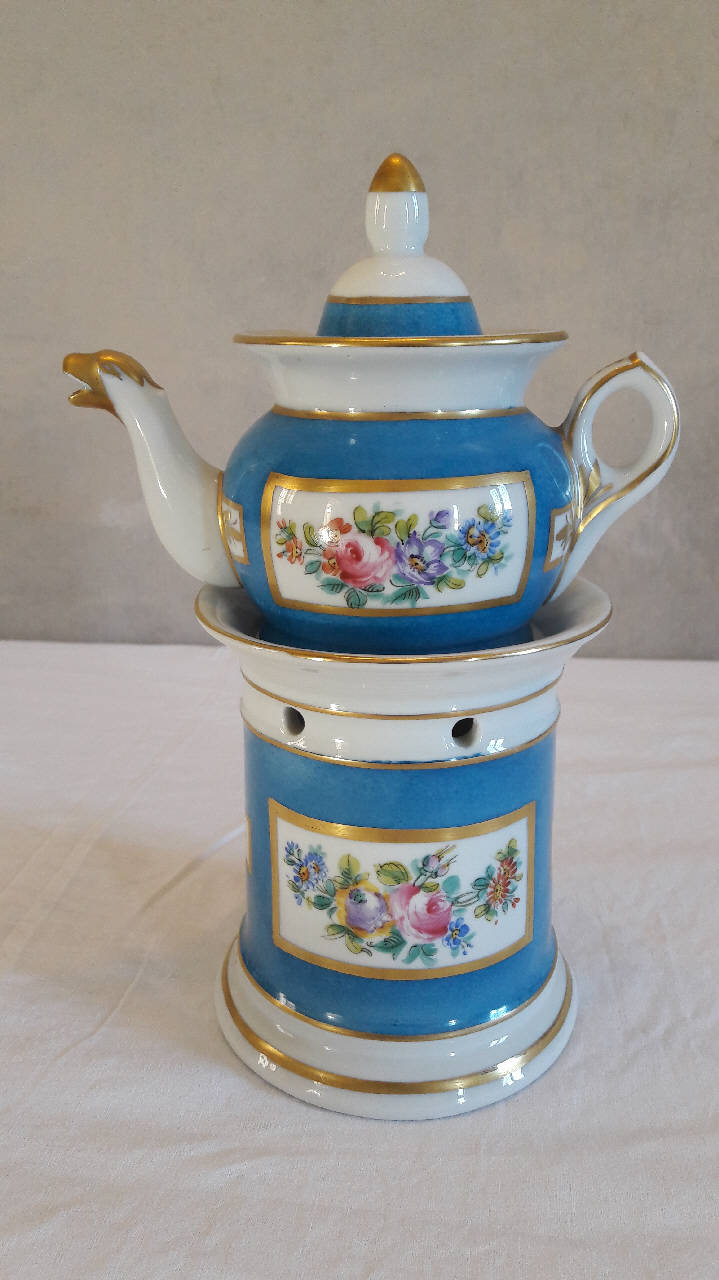 Veilleuse composta da quattro parti: fusto a sezione circolare con leggera sguscia nella parte inferiore, apertura per il godet, fori per areazione in alto, orlo superiore espanso; godet all'interno del fusto; teiera di forma panciuta con invaso, orlo superiore espanso, manico ad orecchio con bitorzolo, beccuccio mosso con terminazione a testa di animale dorata; coperchio con presa a punta dorata. A fondo bianco e turchese, presenta sul corpo di fusto e teiera fiori policromi dipinti a mano entro rettangoli profilati in oro; linee dorate per gli orli di fusto e teiera, sul coperchio, sul manico e sul beccuccio.