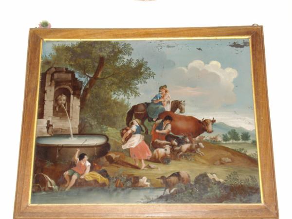 Scena campestre con contadini, animali, fontana, paesaggio. scene con contadini, animali, paesaggi
