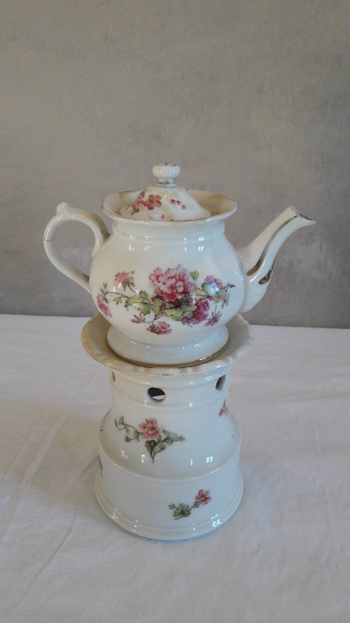 Veilleuse composta da tre parti: fusto con piede ad anello ed orlo superiore svasato e mosso, apertura per il godet, fori superiori per areazione; teiera con orlo espanso mosso e manico ad orecchio con bitorzolo, beccuccio mosso; coperchio con presa a pomolo. Su fondo bianco, si staglia la decorazione data da motivi floreali rosa e arancio chiaro con foglie verdi resi con la tecnica della decalcomania ritoccata a mano. Profilature dorate x gli orli del fusto e della teiera, del manico, del beccuccio e del pomolo del coperchio.