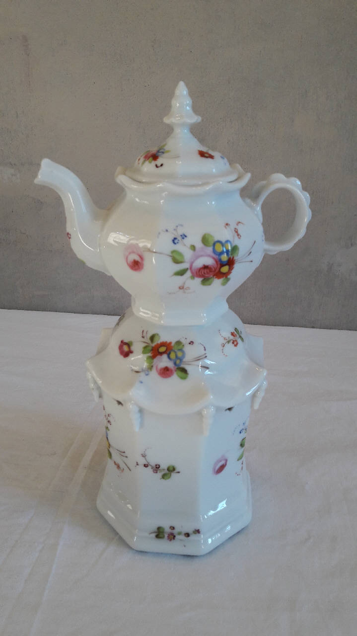 La veilleuse a fondo bianco si compone di quattro elementi: fusto esagonale con piede espanso, apertura per il godet, fori superiori per areazione, orlo superiore mosso rastremato verso l'alto; godet all'interno del fusto; teiera panciuta sfaccettata, orlo espanso ondulato, manico ad anello, mosso esternamente, beccuccio con parte terminale mossa; coperchio a cupola con presa a punta. Presenta una delicata decorazione floreale multicolore e multi varietà dipinta a mano sul fusto, il corpo della teiera e il relat\nivo coperchio; elementi decorativi in rilievo.