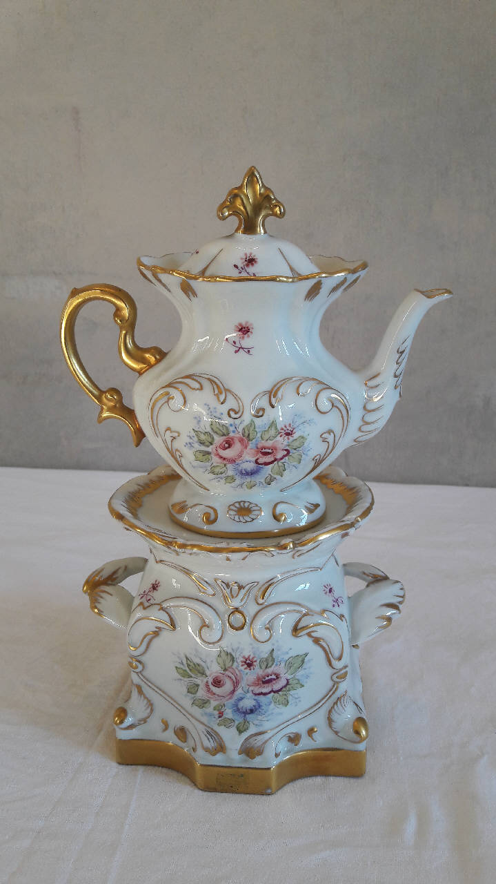 Veilleuse in porcellana dipinta a mano riccamente decorata con raffigurazioni di motivi floreali policromi raggruppati in mazzi, profilature dorate; elementi decorativi a rilievo. Composta di tre pezzi: fusto a base mistilinea rastremato verso l'alto, orlo superiore aggettante con profilo elaborato, due anse laterali sporgenti, apertura laterale per il godet; teiera con invaso, orlo inferiore restringentesi verso l'alto, corpo bombato, orlo superiore molto espanso, con profilo elaborato, manico ad orecchio e beccuccio mosso; coperchio con presa "a pennacchi". La decorazione di fusto e teiera, dipinta a mano, è composta da un centro con fiori multicolori su \nfondo bianco, contornati da arabeschi e volute in oro a rilievo. Dorature rifiniscono le anse, gli orli, il manico e il beccuccio della teiera, pomolo dorato del coperchio. Di fattura novecentesca che riprende i modelli di metà dell'800.