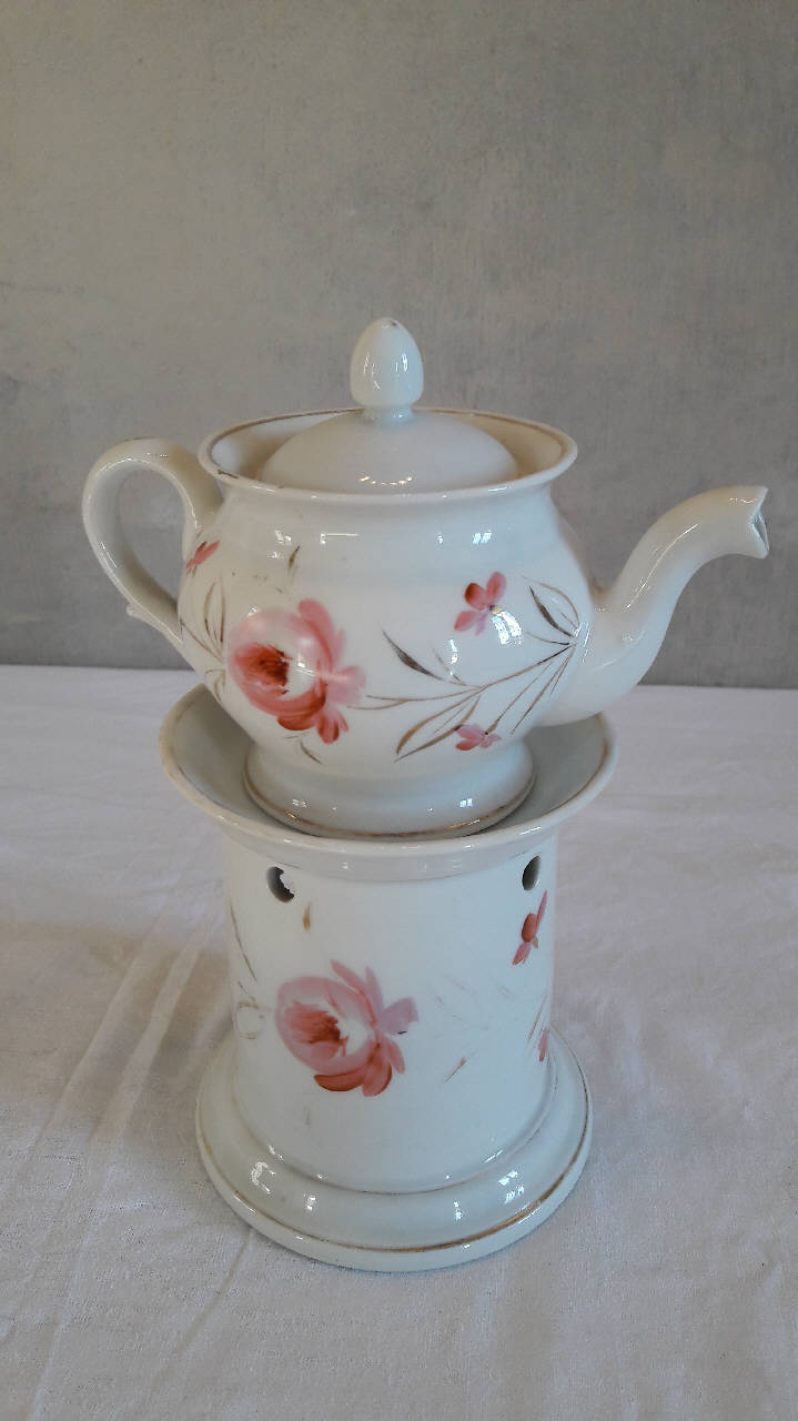 La veilleuse si compone di quattro elementi: fusto a sezione circolare con piede ad anello ed orlo superiore svasato, apertura inferiore per il godet, fori per areazione in alto; godet all'interno del fusto; teiera con orlo espanso e manico ad orecchio, beccuccio mosso; coperchio con presa a punta. Decorazione dipinta a mano con fiori rosa, foglie e ramoscelli dorati. Profilature dorate per gli orli del fusto e della teiera.
