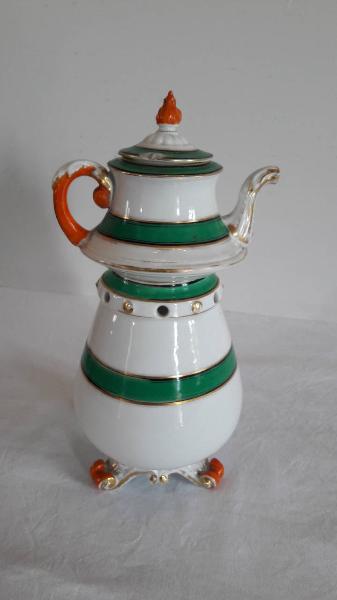 La veilleuse si compone di tre elementi: fusto a bulbo poggiante su piedini a voluta, fori circolari superiori per l'areazione, apertura inferiore per il godet; teiera dalla forma allargata nella parte inferiore, presenta il becco e il manico decorati a rilievo; coperchio a cupola con decorazione a rilievo e presa a fiamma. Rilevazioni ed orli sono sottolineati in oro; il manico, la presa del coperchio e i piedini sono dipinti in color arancione; fasce decorative di color verde lungo il fusto, il corpo della teiera e il relativo coperchio.