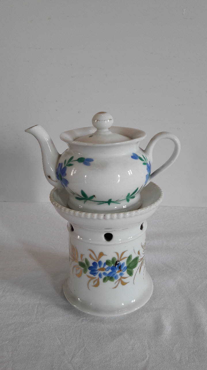 Veilleuse bianca in porcellana dipinta a mano con decorazione sul fusto e sul corpo della teiera data da fiori blu e foglie verdi e oro; profilature dorate lungo il beccuccio e il pomolo della teiera. Composta da tre parti: fusto a sezione circolare con fori circolari per areazione nella parte superiore, orlo superiore aggettante, terminato da perline sferiche; teiera di forma panciuta con invaso, orlo superiore espanso, manico ad orecchio, beccuccio lievemente mosso. Coperchio con presa a pomolo.