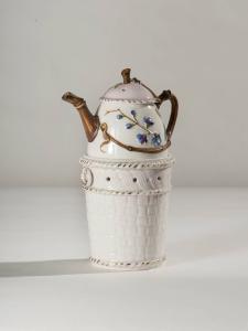 Veilleuse di gusto "orientaleggiante" in porcellana bianca con decorazione a rilievo in parte dipinta a mano: manico, beccuccio e motivi vegetali a mo' di bambù; profilature dorate per gli orli. Composta da quattro parti:\n fusto a sezione circolare a forma di cestino impagliato con due anelli come presa, rastremato verso il basso e concluso con motivo a cordoncino, apertura inferiore per il godet, fori per areazione nella parte superiore, orlo superiore espanso con motivo a cordoncino; godet (piccolo recipiente atto a contenere l'olio e il lucignolo) all'interno del fusto; teiera di forma rastremata verso l'alto con coperchio; il manico ad orecchio, il beccuccio e l'impugnatura del coperchio imitano le forme del bambù.
