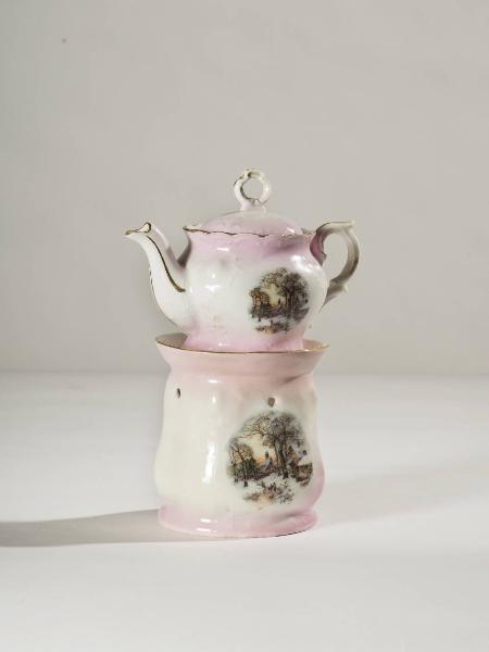 La veilleuse si compone di quattro elementi: fusto a sezione circolare lievemente svasato al fondo con ampia apertura per il godet, orlo superiore espanso, fori circolari per areazione; godet all'interno del fusto; teiera con orlo smerlato e manico a volute, beccuccio mosso, coperchio con presa ad anello. A fondo bianco e rosa, presenta un apparato decorativo dato da scorci di paesaggi innevati realizzati con la tecnica della decalcomania ritoccata a mano; profilature dorate per gli orli, il manico, il beccuccio e la presa del coperchio della teiera.