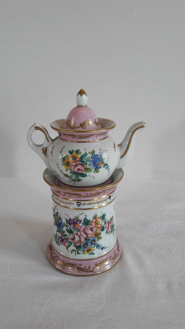 La veilleuse si compone di quattro elementi: fusto a sezione cilindrica con allargamento inferiore, apertura per il godet, fori circolari per areazione, orlo circolare superiore espanso; godet all'interno del fusto; teiera panciuta con lungo becco, orlo espanso, manico ad anello; coperchio con presa a punta. L'apparato decorativo è dato da motivi floreali multicolore\n e multi varietà presenti sul fusto e sul corpo della teiera; profilature\n dorate per gli orli, il manico, il beccuccio e il pomolo del coperchio. Motivi decorativi vegetali stilizzati in oro su fondo rosa e bianco. Di fattura novecentesca che riprende modelli dell'800.