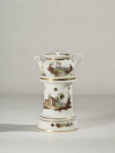 La veilleuse si compone di quattro elementi: base ad anello con fori per areazione; fusto cilindrico lievemente rastremato verso l'alto con orli in aggetto, fori superiori per areazione; bassa teiera panciuta con orlo espanso e manico ad anello, beccuccio mosso; coperchio con presa a pomolo. La decorazione dipinta a mano consta di vedute con paesaggi rurali presenti sulla base, il fusto e la teiera. Gli orli sono profilati in oro, fondo bianco.