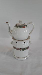 La veilleuse color bianco si compone di quattro elementi: fusto scanalato biansato con base ed orlo mossi, apertura inferiore per il godet, fori superiori per areazione; godet all'interno del fusto; alta teiera, pure scanalata con manico ad orecchio e lungo becco mosso; coperchio con presa a pomolo. La decorazione consta di motivi floreali stilizzati presenti sul fusto e sulla teiera resi con la tecnica della decalcomania ritoccata a mano; profilature dorate per gli orli, i manici del fusto, il beccuccio e il manico della teiera, il pomolo del coperchio.