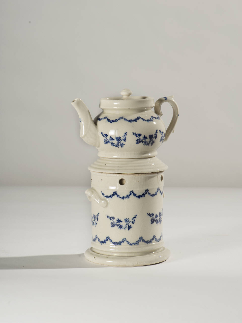 La veilleuse color crema si compone di cinque elementi: fusto cilindrico biansato con base ad anello, colletto scanalato e rastremato verso l'alto, apertura inferiore per il godet, fori superiori per areazione; godet all'interno del fusto; vaschetta circolare per bagnomaria; teiera con manico ad orecchio, grande becco costolato all'interno ed orlo ad anello; coperchio con presa a pomolo. La decorazione a monocromo blu dipinta a mano consta di piccoli mazzi di fiori stilizzati e ghirlandine fogliate.