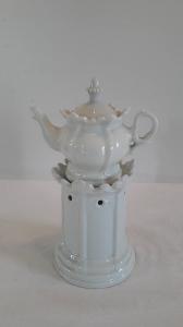 La veilleuse in porcellana bianca si compone di tre elementi: fusto a sezione circolare con base a gradini rastremata verso l'alto, apertura per il godet nella parte inferiore, fori circolari per areazione nella parte superiore, orlo superiore espanso frastagliato. Il corpo del fusto è suddivis\no in specchiature rettangolari mediante esili pilastri in rilievo; teiera di forma panciuta con invaso, orlo superiore espanso e frastagliato, manico ad orecchio, beccuccio mosso; coperchio con presa a punta. Il corpo della teiera è diviso in scomparti mediante baccellature in rilievo. Di fattu\nra novecentesca che riprende i modelli dell'800.