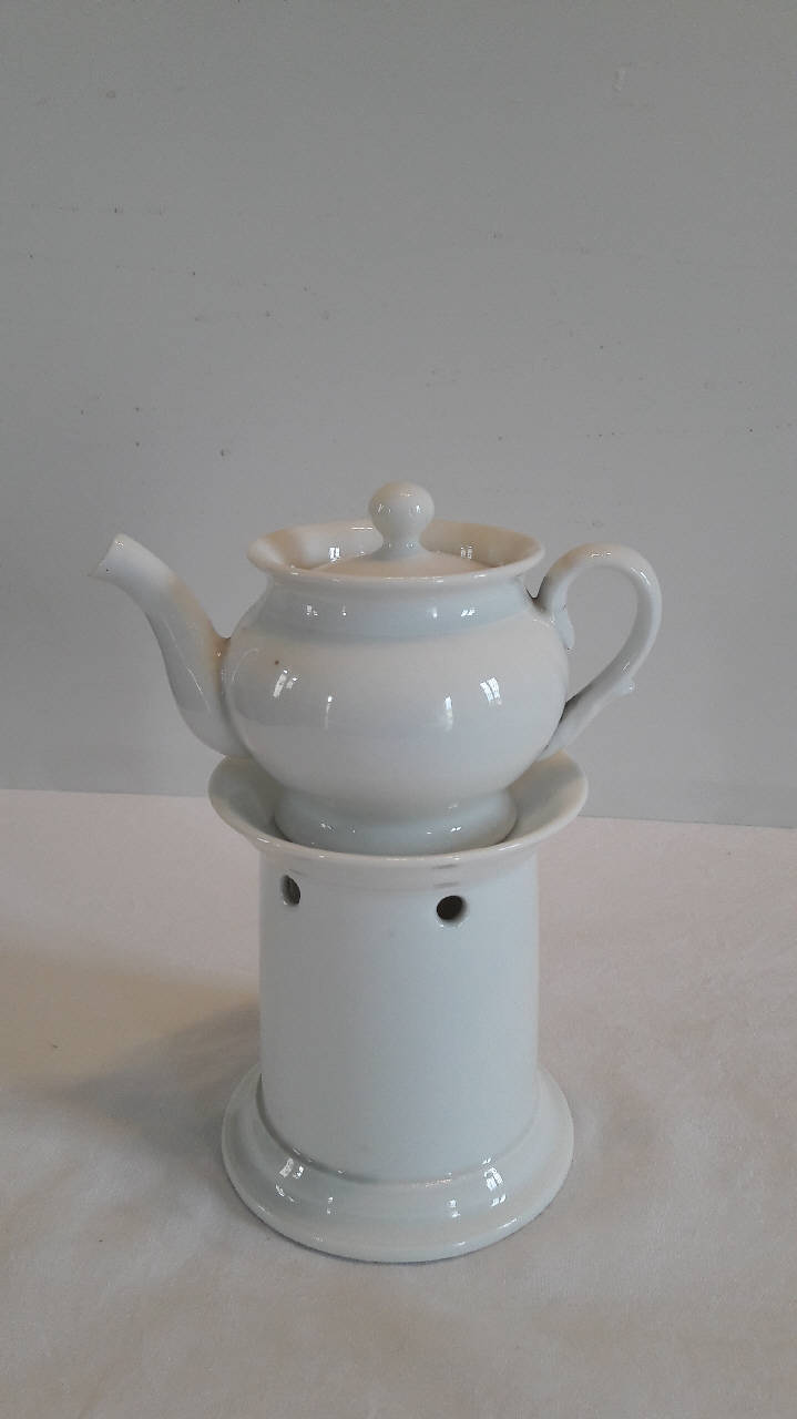 La veilleuse in porcellana bianca si compone di quattro elementi: fusto cilindrico lievemente rastremato verso l'alto con base ad anello ed orlo superiore espanso, apertura inferiore per il godet che si trova all'interno del fusto, fori circolari superiori per areazione; teiera con manico ad orecchio, beccuccio mosso; coperchio con presa a pomolo.