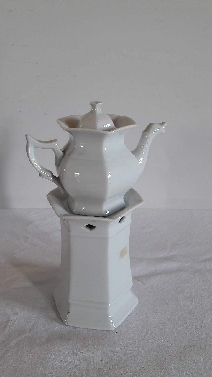 La veilleuse in porcellana bianca si compone di quattro elementi: fusto esagonale con base ed orlo aggettanti, apertura inferiore per il godet, fori circolari superiori a forma di losanga per areazione; godet all'interno del fusto; teiera panciuta dalla forma esagonale, manico ad orecchio e beccuccio mosso; coperchio esagonale con impugnatura data da un pomolo anch'esso dalla foggia esagonale.