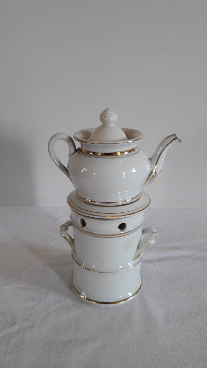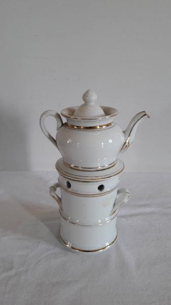 La veilleuse si compone di cinque elementi: fusto con base cilindrica biansato, apertura inferiore per il godet, fori circolari superiori per l'areazione; godet all'interno del fusto; vaschetta per bagnomaria con orlo superiore ad anello; teiera a sezione circolare con invaso rastremato, beccuccio mosso e manico ad orecchio; coperchio con presa a punta. A fondo bianco, la decorazione consta di profilature dorate per i diversi orli, lettere intrecciate dorate presenti sul fusto e il corpo della teiera.