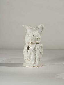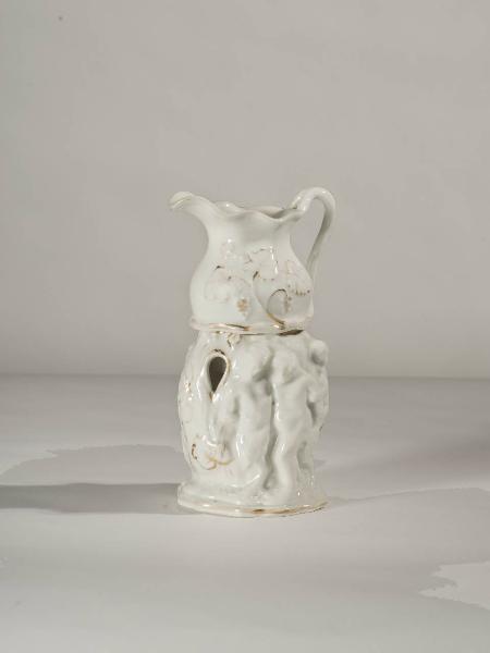 La veilleuse si compone di due elementi: fusto con apertura inferiore per il godet, due fori superiori per areazione; bricco con manico ad orecchio, bordo superiore ondulato. Il fusto presenta una decorazione a rilievo data da tre bimbi su una capretta, tralci di vite e tre figure umane nude; il bricco presenta una decorazione sempre in rilievo data da motivi vegetali con tralci di vite. Profilature dorate per gli orli e per i vari elementi che compongono la decorazione in rilievo.