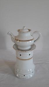 Veilleuse composta da cinque pezzi: base ad anello rastremata verso l'alto con fori circolari per areazione; fusto a sezione circolare con fori per areazione nella parte superiore, orlo superiore espanso e a smerlo; godet circolare posto all'interno del fusto; teiera di forma panciuta con invaso, orlo superiore espanso, grande manico ad orecchio, beccuccio mosso; coperchio con presa a pomolo. Presenta motivi decorativi floreali e vegetali a rilievo in prossimità del beccuccio e sul manico della teiera. Fasce dec\norative dorate lungo il corpo del fusto e della teiera, profilature dorate per gli orli.