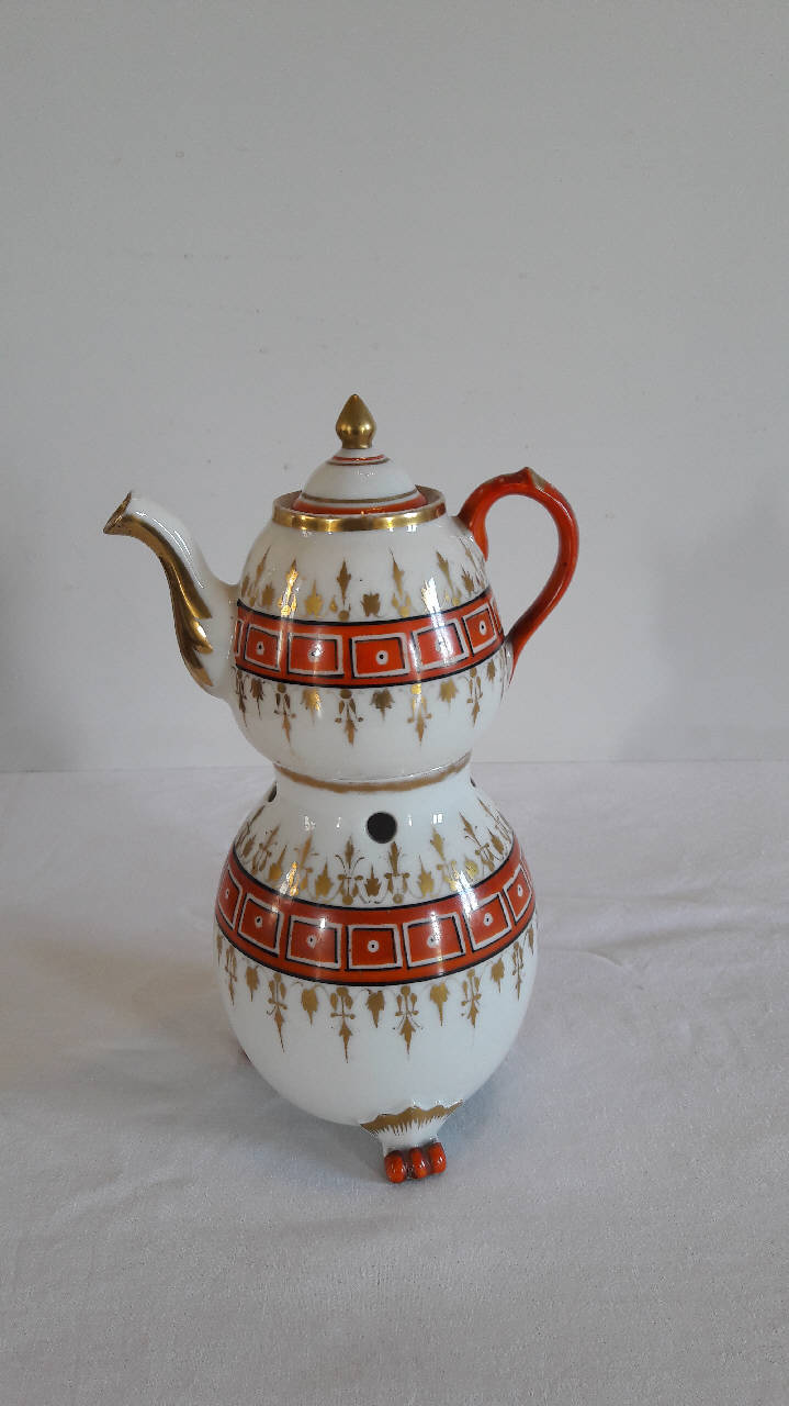 La veilleuse si compone di quattro elementi: fusto ovoidale poggiante su tre piedini a zampa di leone con innesto rilevato, apertura inferiore per il godet, fori circolari superiori per areazione; godet all'interno del fusto; teiera ovoidale con manico ad orecchio, beccuccio mosso; coperchio a cupola con presa a punta. Su fondo bianco, l'apparato decorativo consta di motivi geometrici posti all'interno di fasce di colore arancione con profilature nere, motivi vegetali stilizzati in oro. Profilature in oro, arancio e nero per gli orli, manico e piedini dipinti in arancio; il pomolo del coperchio è dorato .