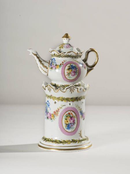 La veilleuse si compone di quattro elementi: fusto a sezione circolare con leggera sguscia nella parte inferiore e apertura per il godet, fori circolari per areazione nella parte superiore, orlo superiore espanso frastagliato; godet all'interno del fusto; teiera di forma panciuta con invaso, parte inferiore lievemente allungata, orlo superiore espanso e frastagliato, grande manico ad orecchio, beccuccio mosso; coperchio con presa a punta. Presenta su fondo bianco una decorazione floreale policroma riunita entro medaglioni delimitati da profilature rosa e oro; festoni di fiori policromi con nastri azzurri e corone composte da foglie verdi. Motivi decorativi in oro e profilature dorate lungo gli orli e i vari elementi che compongono la veilleuse. Di fattura novecentesca che riprende i modelli dell'800.