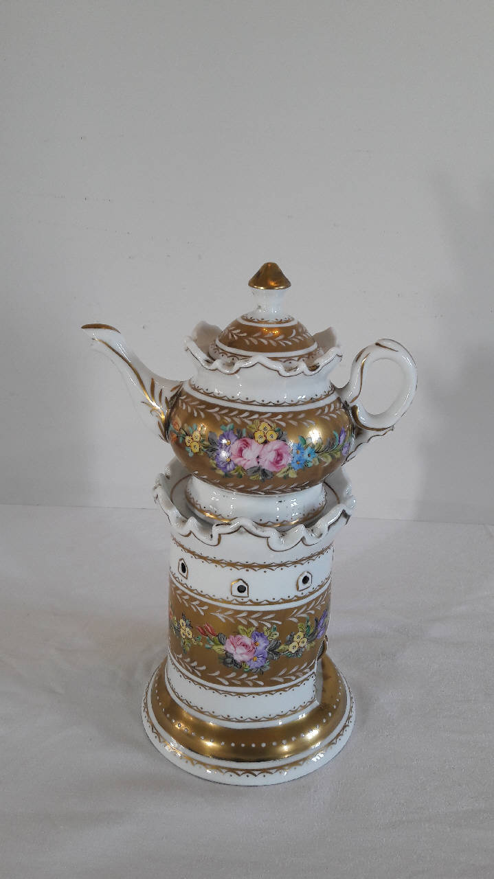 La veilleuse si compone di quattro elementi: fusto con piede rastremato verso l'alto, apertura per il godet, fori superiori per l'areazione, orlo in aggetto terminato a smerlo; godet posto all'interno del fusto; teiera con invaso, orlo espanso smerlato, manico a orecchio e beccuccio mosso; coperchio con presa a pomolo. A fondo bianco, è riccamente decorata con motivi\n floreali policromi e multi varietà all'interno di fasce dorate. Profilat\nure dorate per gli orli accompagnate da motivi decorativi stilizzati sempre in oro. Di fattura novecentesca che riprende i modelli dell'800.