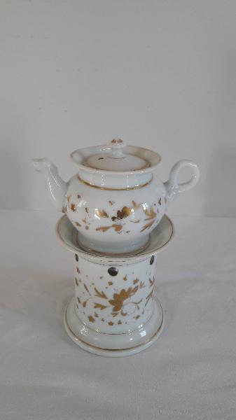 Veilleuse composta da quattro pezzi: fusto con base ad anello a sezione circolare rastremata verso l'alto, apertura inferiore per il godet, fori circolari per areazione nella parte superiore, orlo superiore espanso; godet posto all'interno del fusto; teiera di forma panciuta con invaso, orlo superiore espanso, manico ad anello, beccuccio mosso; coperchio con foro e presa a fiore stilizzato. A fondo bianco, presenta sul fusto e sulla teiera motivi decorativi floreali dorati dipinti a mano; profilature dorate per gli orli.