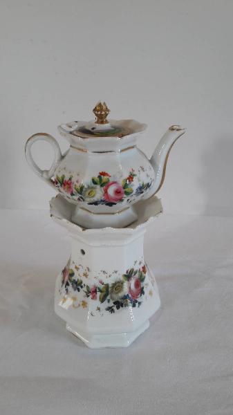 La veilleuse a fondo bianco si compone di tre elementi: fusto poligonale con piede espanso, apertura per il godet, fori superiori per areazione, orlo superiore frastagliato; teiera panciuta sfaccettata con invaso, orlo espanso frastagliato, manico ad anello, beccuccio mosso; coperchio munito di foro e presa a punta dorata. Presenta una decorazione floreale multicolore e multi varietà dipinta a mano sul fusto e sul corpo della teiera; profi\nlature dorate per gli orli.