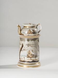 Veilleuse in porcellana dipinta a mano con decorazione sul fusto e sulla teiera data da scorci di paesaggi innevati con case e figure; profilature dorate per gli orli e alcuni elementi. Composta da tre parti: fusto con base ad anello rastremato verso l'alto, fori per areazione, orlo superiore aggettante; teiera dalla forma panciuta con invaso, orlo superiore espanso, manico ad orecchio, beccuccio lievemente mosso e corto. Coperchio con presa a pomolo.