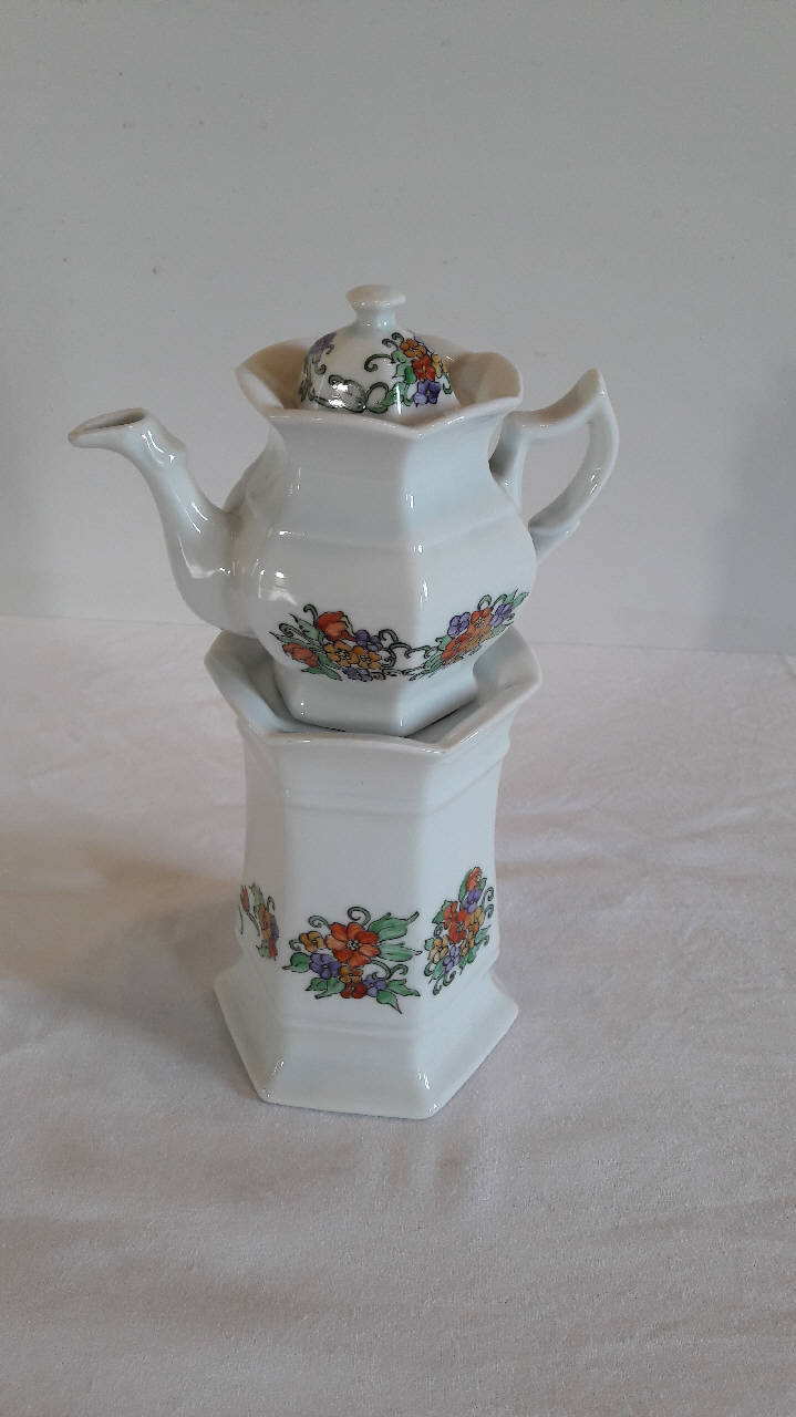 Veilleuse composta da quattro parti: fusto a sezione esagonale con base di appoggio rastremata verso l'alto, orlo superiore aggettante, apertura inferiore per il godet posto all'interno del fusto; teiera con invaso, di forma esagonale, orlo superiore espanso, manico ad orecchio stilizzato, beccuccio mosso; coperchio con presa a pomolo. A fondo bianco, presenta una semplice decorazione dipinta a mano data da mazzetti di fiori di vario colore. Di fattura novecentesca con richiamo ai modelli dell'800.