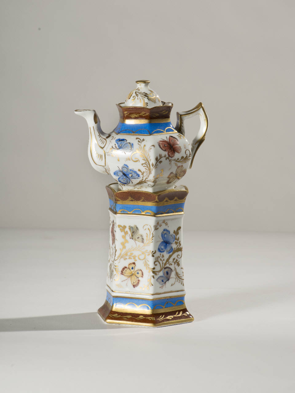 Veilleuse composta da quattro parti: fusto a sezione esagonale con base di appoggio rastremata verso l'alto, orlo superiore aggettante, apertura inferiore per il godet posto all'interno del fusto; teiera con invaso, di forma esagonale, orlo superiore espanso, manico ad orecchio stilizzato, beccuccio mosso; coperchio con presa a pomolo. A fondo bianco, presenta una decorazione dipinta a mano data da farfalle di diversa colorazione e motivi decorativi a racemi in oro. Fasce decorative in azzurro e color marrone recanti all'interno motivi decorativi stilizzati in oro; profilature dorate per gli orli, il manico, il beccuccio e il pomolo della teiera. Di fattura novecentesca con richiamo ai modelli dell'800.