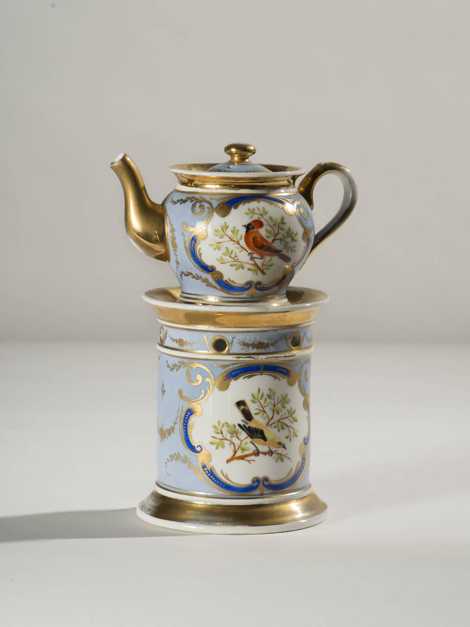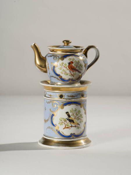 La veilleuse si compone di quattro elementi: fusto a sezione circolare con piede ad anello ed orlo superiore svasato, apertura inferiore per il godet, fori per areazione in alto; godet all'interno del fusto; teiera con orlo espanso e manico ad orecchio, beccuccio mosso; coperchio con presa a pomolo. Su fondo bianco e azzurro è presente nella parte anteriore l'apparat\no decorativo dato da uccellini variopinti posti su rami d'albero all'interno di medaglioni che recano profilature dorate e azzurre; decorazioni floreali a ghirlande dorate. Nella parte posteriore, motivi floreali variopinti e ghirlande floreali dorate. Profilature dorate per gli orli del fusto e della teiera; il beccuccio, il pomolo del coperchio e il manico della teiera sono interamente dorati.