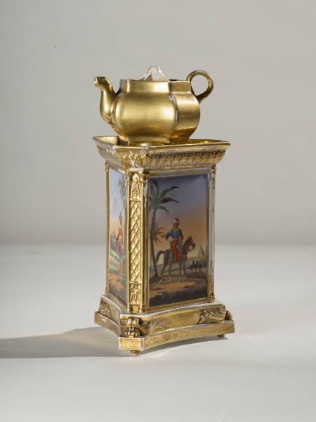 Veilleuse in porcellana dipinta a mano composta da quattro parti: base triangolare dorata poggiante su tre piedini con zampe leonine e motivi decorativi vegetali in rilievo; fusto a sezione triangolare con orlo superiore aggettante munito di tre fori per l'areazione nella parte alta; motivi decorativi in rilievo dorati sono presenti lungo l'orlo superiore e lungo i tre pilastri che dividono le tre facce del fusto. Teiera con invaso, interamente dorata nella parte esteriore; presenta una forma sfaccettata, manico ad anello, beccuccio corto e mosso, coperchio munito di foro. La decorazione pittorica entro le tre specchiature rettangolari del fusto consta di: un uomo a cavallo in abiti mediorientali con piramidi sullo sfondo; una figura femminile con un gruppo di soldati con lance posti in secondo piano; un uomo in uniforme regale e sullo sfondo accampamento di tende.