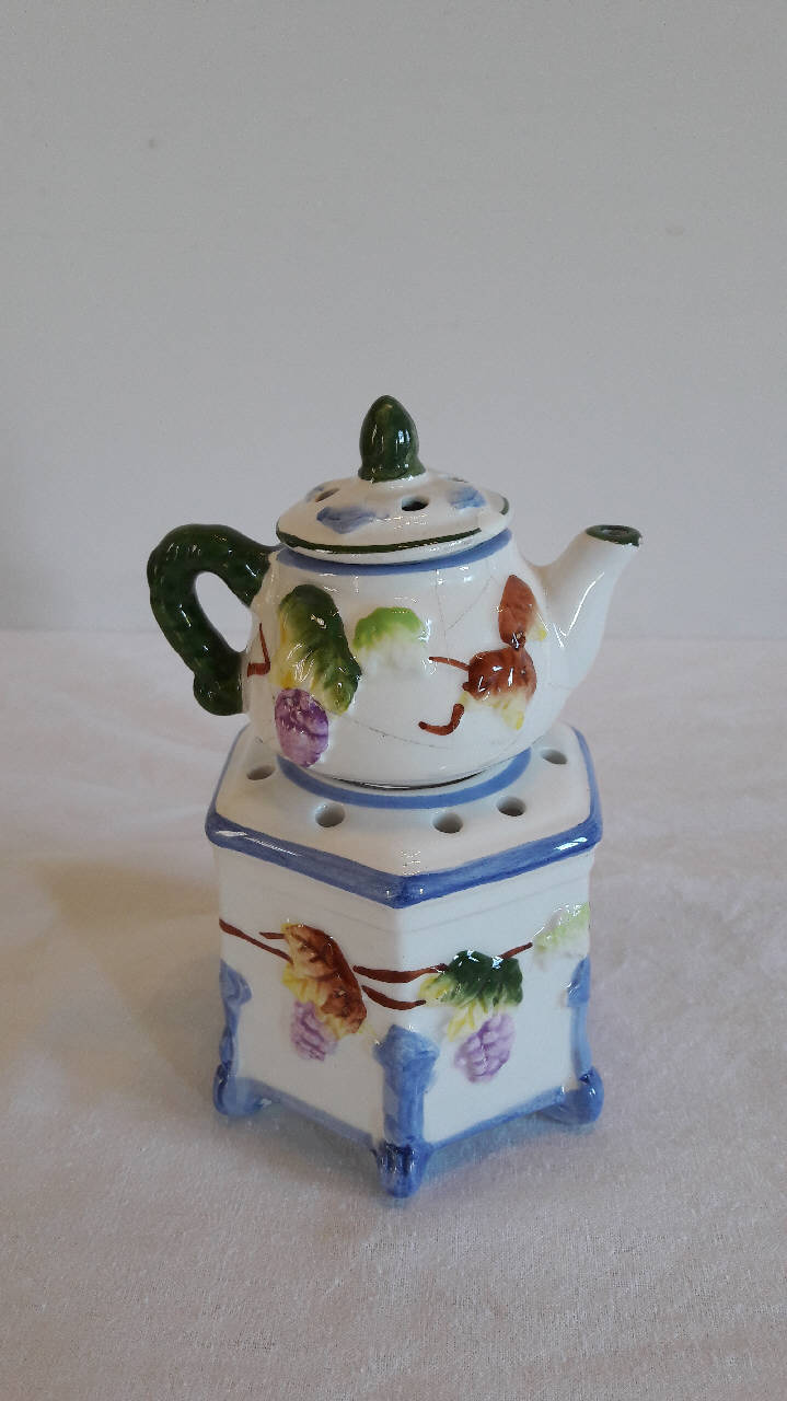 Veilleuse composta da tre parti: fusto a sezione esagonale poggiante su piedini, apertura per il godet, fori circolari superiori per areazione; teiera dalla forma panciuta, manico ad orecchio, beccuccio mosso; coperchio con fori e presa a punta. Su fondo bianco, la decorazione dipinta a mano è \ndata da grappoli di uva presenti sul fusto e il corpo della teiera; profilature azzurre e verdi per gli orli e alcune componenti. La veilleuse fa parte della piccola raccolta di pezzi in miniatura, destinati in origine a gioco per bambine.