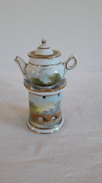 Veilleuse composta da quattro parti: fusto a sezione circolare con anello alla base, apertura per il godet, fori circolari superiori per areazione, orlo espanso concluso da merlatura; godet posto all'interno del fusto; teiera con invaso dalla forma panciuta, manico ad orecchio, beccuccio mosso; coperchio con presa a punta. Su fondo bianco, la decorazione pittorica è \ndata da raffigurazioni di paesaggi presenti sul fusto e il corpo della teiera; profilature dorate per gli orli e alcune componenti. La veilleuse fa parte della piccola raccolta di pezzi in miniatura, destinati in origine a gioco per bambine.