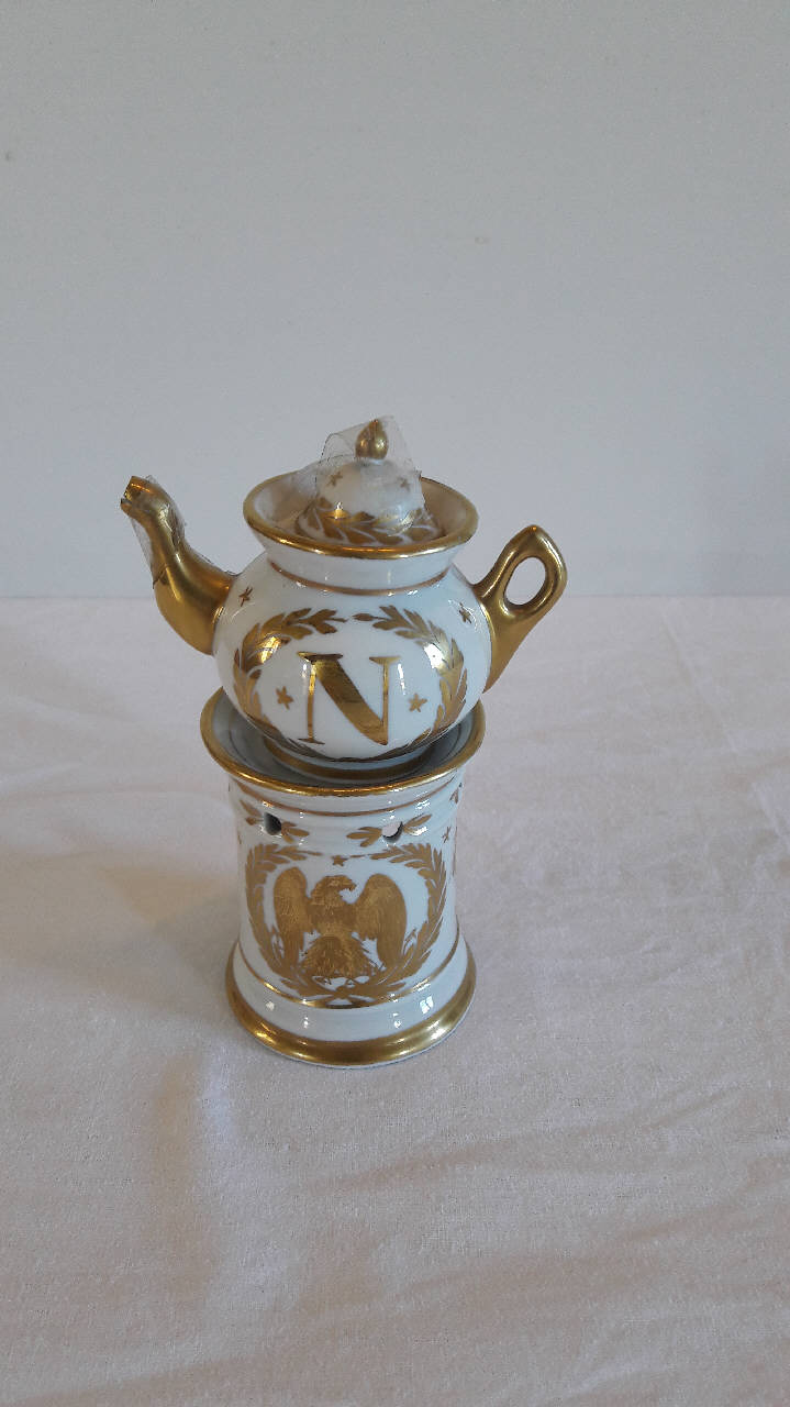 Veilleuse composta da quattro parti: fusto a sezione circolare con anello alla base, apertura per il godet, fori circolari superiori per areazione, orlo superiore espanso; godet posto all'interno del fusto; teiera dalla forma panciuta, manico ad orecchio, beccuccio mosso e pronunciato; coperchio con presa a punta. Su fondo bianco, la decorazione pittorica in oro della teiera è data dalla lettera "N" in lettere capitale contornata da una gh\nirlanda con motivi decorativi vegetali stilizzati, piccole stelle e insetti sparsi sulla superficie. Sul fusto, sempre in oro, raffigurazione dell'aquila napoleonica, piccole stelle e insetti sparsi. Profilature dorate per gli orli; il manico, il beccuccio e il pomolo del coperchio sono interamente dorati. La veilleuse fa parte della piccola raccolta di pezzi in miniatura, destinati in origine a gioco per bambine.