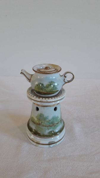 Veilleuse composta da cinque parti: base ad anello di forma tonda; fusto a sezione circolare rastremato verso l'alto, fori circolari superiori per areazione, orlo espanso concluso da motivo decorativo con perline; godet posto all'interno del fusto; teiera con invaso dalla forma panciuta, orlo superiore espanso, manico ad orecchio, beccuccio mosso; coperchio piatto con presa a pomolo. Su fondo bianco, la decorazione pittorica è data da raff\nigurazioni di paesaggi presenti sul fusto e il corpo della teiera; profilature dorate per gli orli e alcune componenti. La veilleuse fa parte della piccola raccolta di pezzi in miniatura, destinati in origine a gioco per bambine.